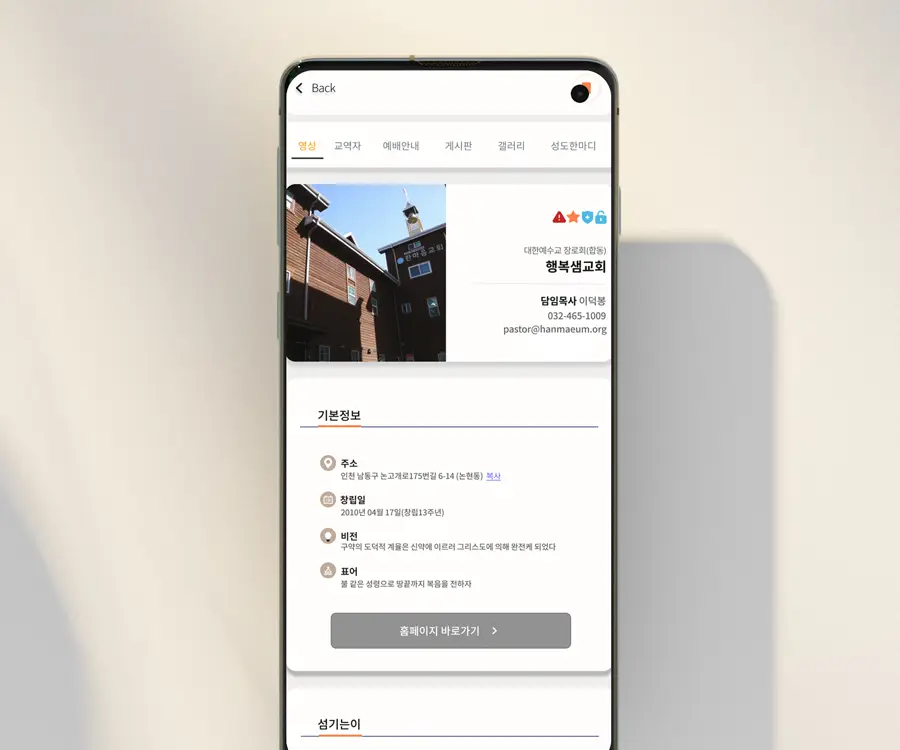 예배 안내, 공지, 소식 전달까지모든 성도와 소통하는 교회만의전용 페이지를 제공합니다.미니홈 형태로 기본정보부터 홍보,교회의 알림을 하나로~