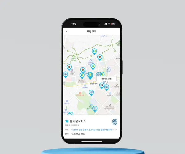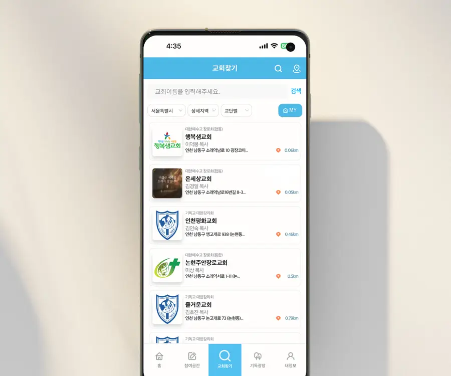 위치 기반으로 가까운 교회를 검색하고페이지 기반의 교회정보를 한눈에 확인할 수 있습니다.