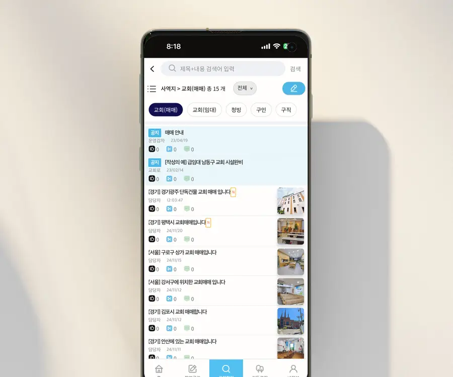 청빙, 구인, 매매, 임대까지교회가 필요할 때 믿고 찾을 수 있는 소통의 장을 제공합니다.매매·임대·청빙·구인 복잡하게 말고 교회로 하나면 충분해요