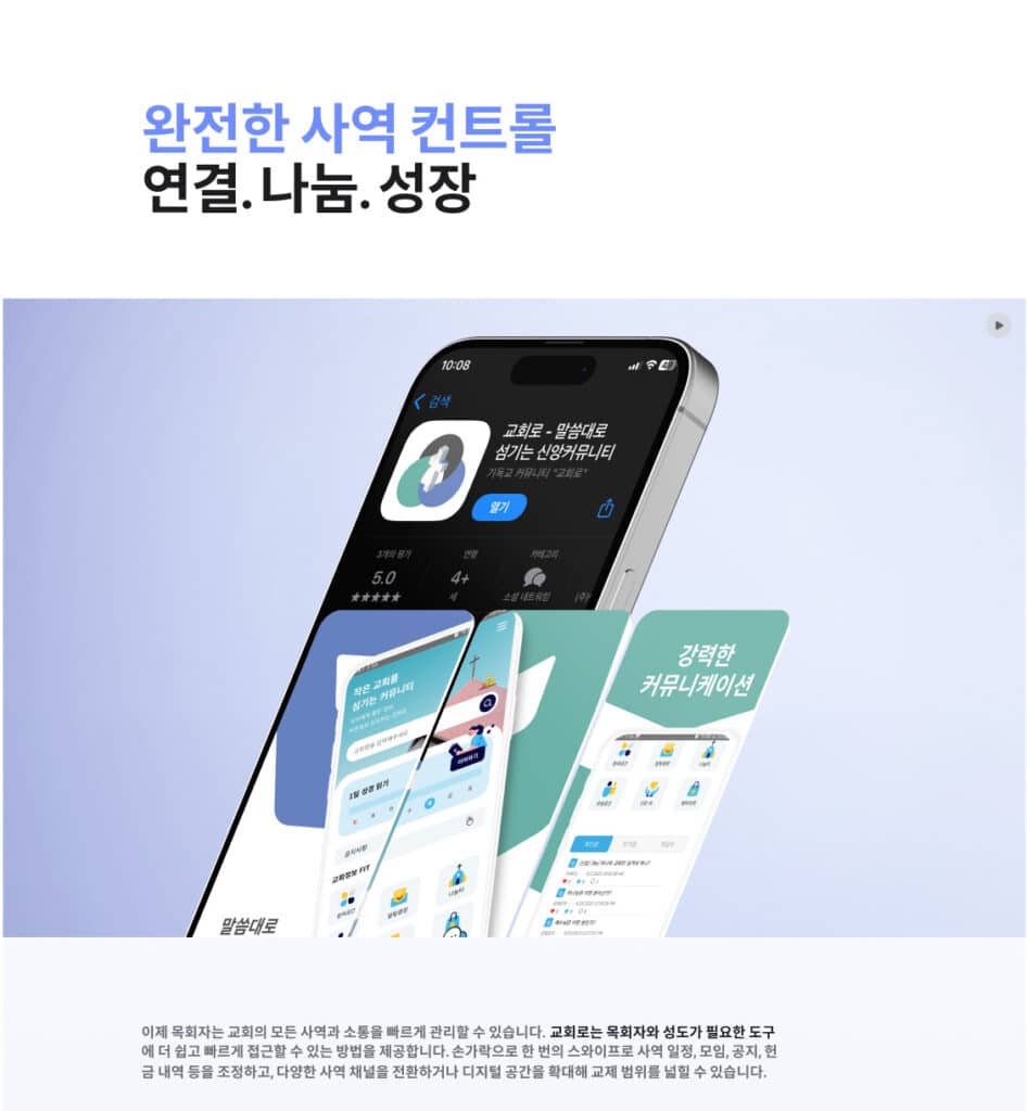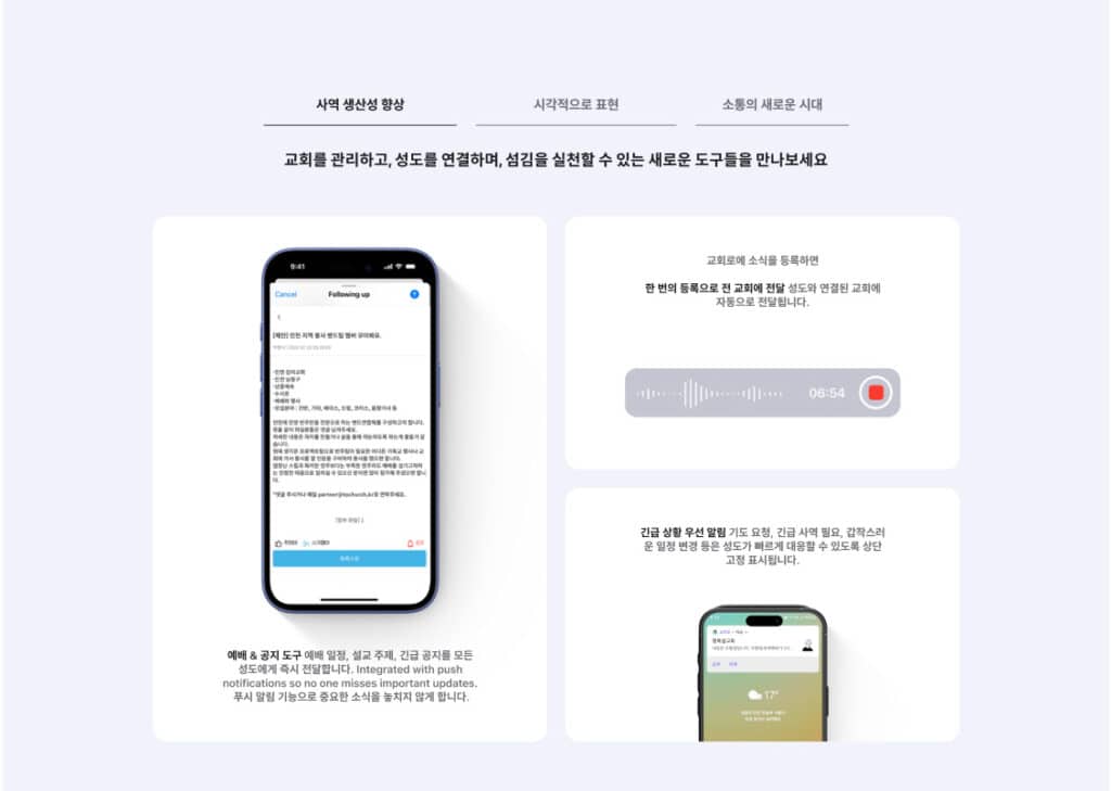 복잡한 작업 없이 손쉽게 제작하여 교회 안내와 소식을 공유할 수 있도록 만들어졌습니다.